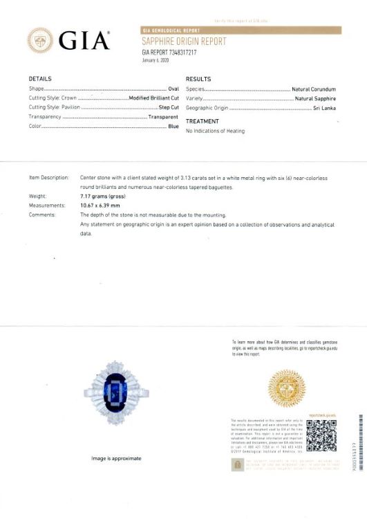 -3.13 carat elongated oval sapphire with GIA report stating Ceylon origin and no evidence of heat