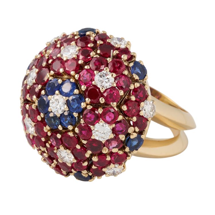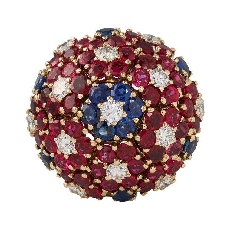 -13 round diamonds approximately 1.50 carats, 54 round rubies approximately 6.00 carats and 12 round blue sapphires approximately 1.50 carats