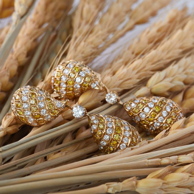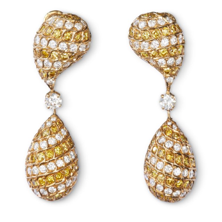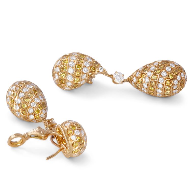 Yellow and white diamond day/night earrings by Alexander, diamonds totaling 9.22 carats, 18 karat yellow gold estate earrings
