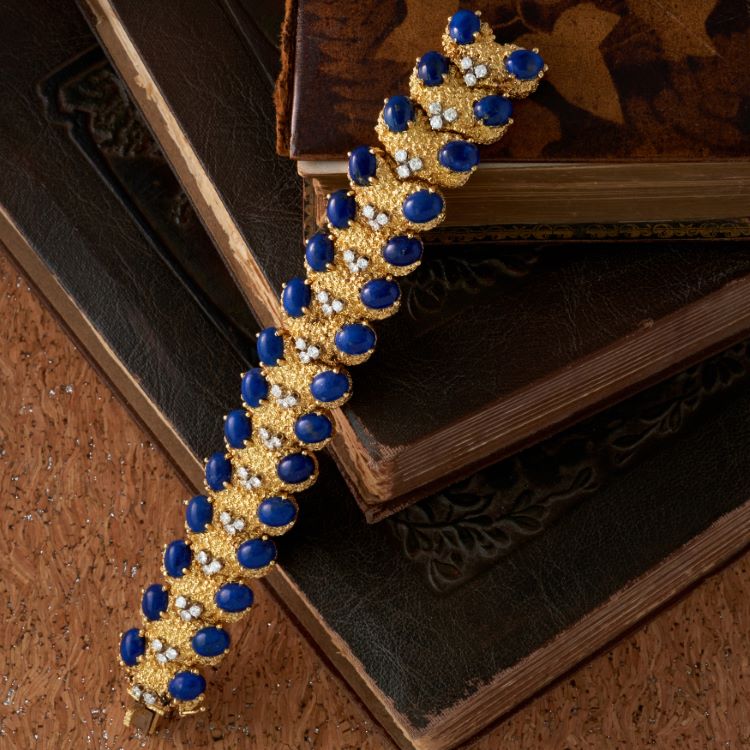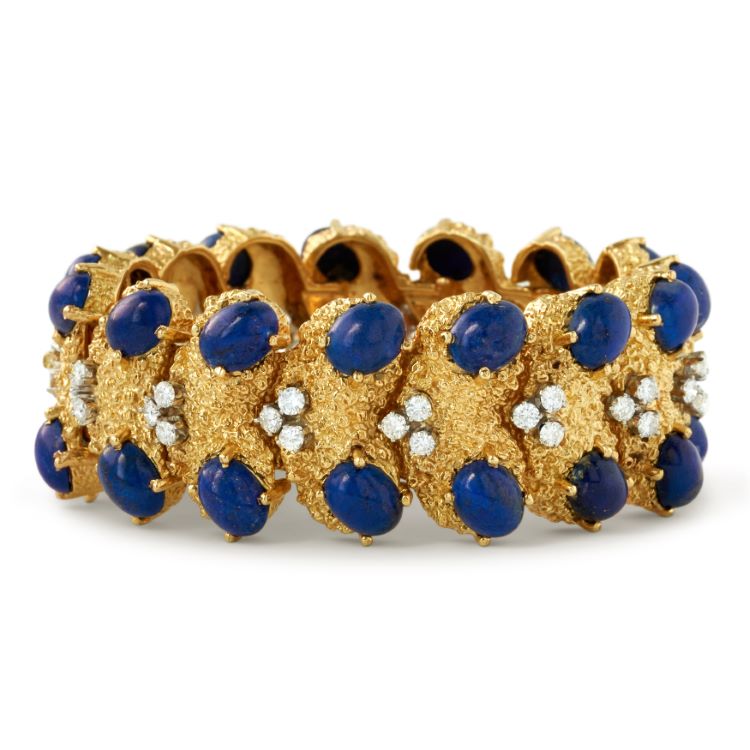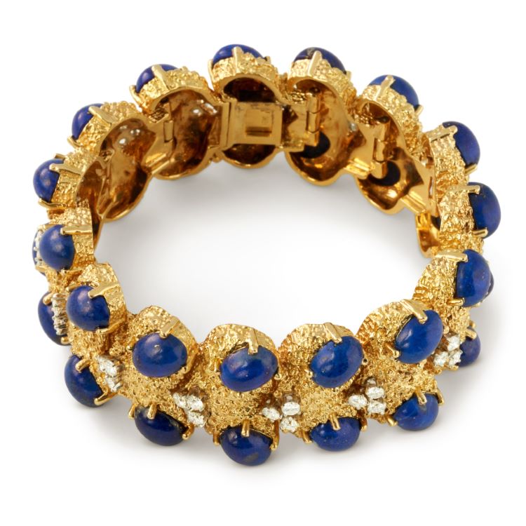 Vintage solid 18 karat yellow gold lapis and diamond bracelet in a textured design, circa 1970s -30 Lapis 9 x 7 oval cabochons and 44 round diamonds approximately 4.00 carats -7 1/4" x 1", gross weight 125.7 grams