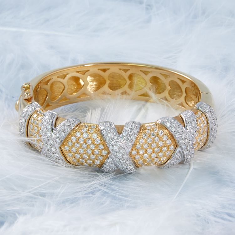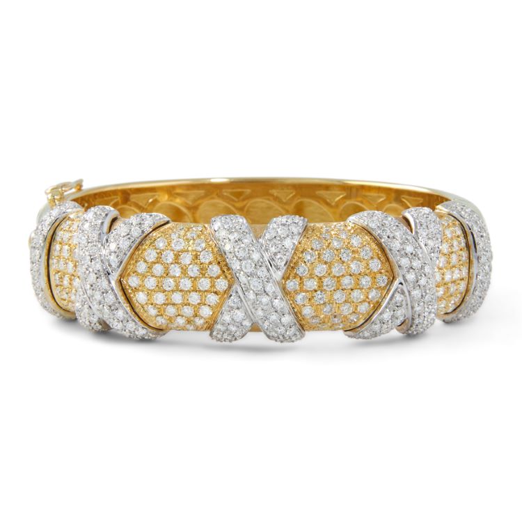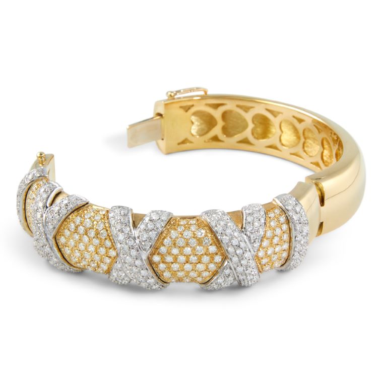 Pavé "Hugs and Kisses" diamond bangle bracelet with approximately 8.00 carats of diamonds, 18 karat yellow and white gold, Italian.