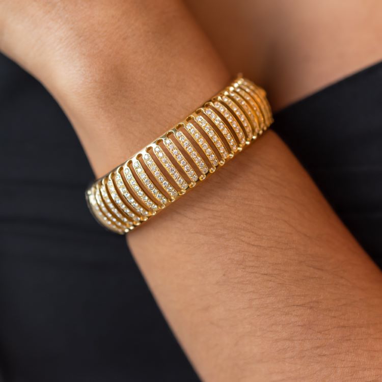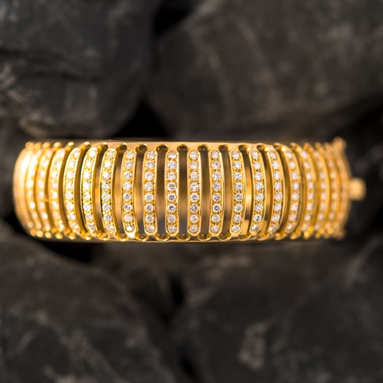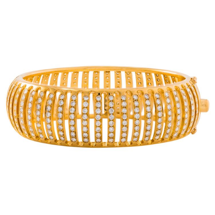 Estate diamond eternity bangle bracelet, Italian, with 360 fine round diamonds approximately 7.00 carats, 18 karat yellow gold.