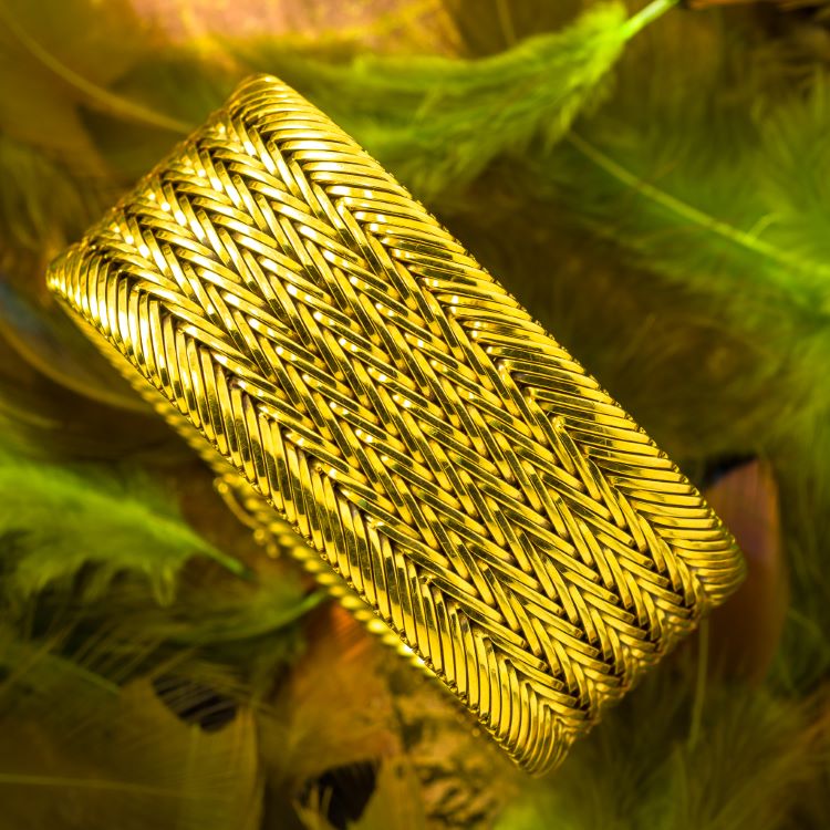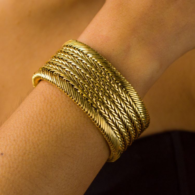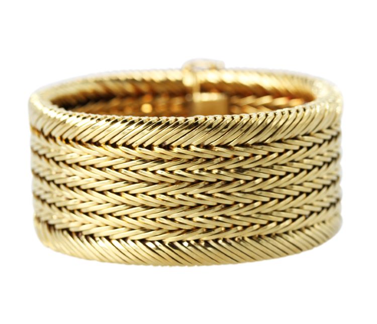 Incredibly well made solid 18 karat yellow gold bracelet, 7 1/2 inches long, 1 1/4 inches wide, very heavy weighing 160 grams. Details -Marked 0.750 with indistinct makers mark -Length 7 1/2 inches, width 1 1/4 inches, 160.5 grams