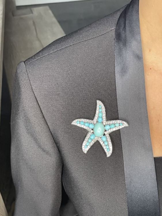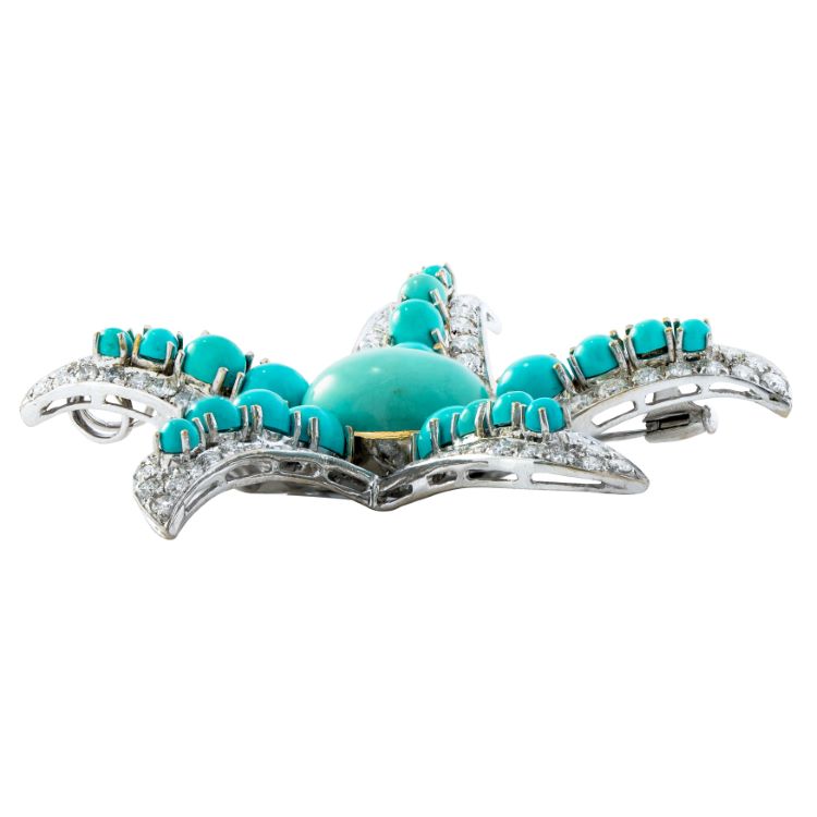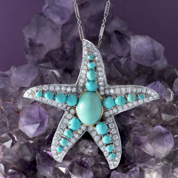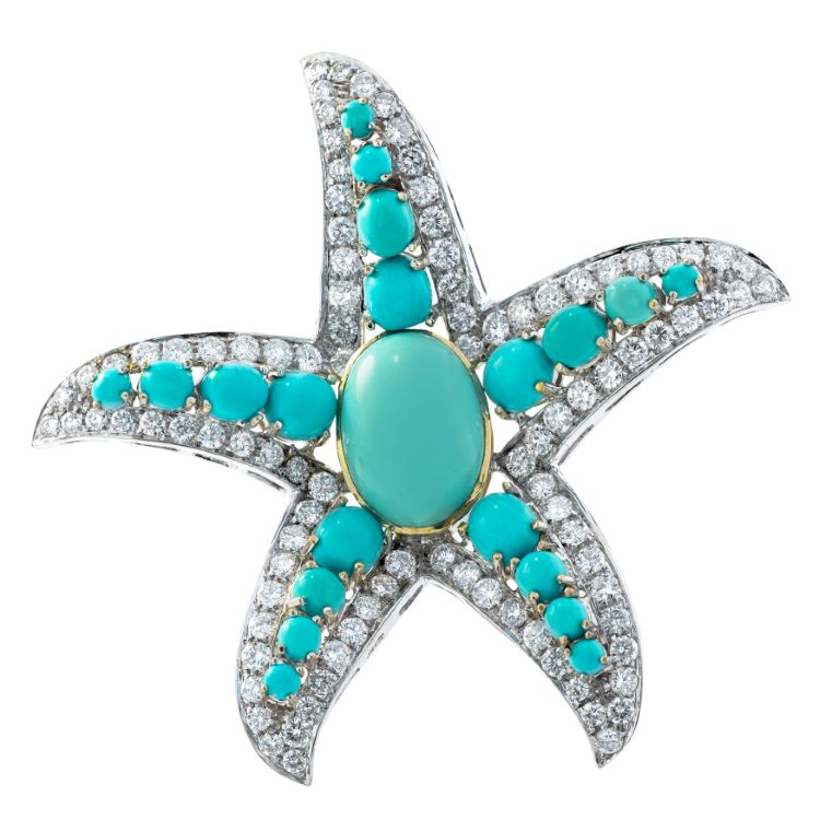 Large turquoise and diamond starfish brooch in 18 karat white gold measuring 3" x 2 1/2" with approximately 7.00 carats of fine diamonds.