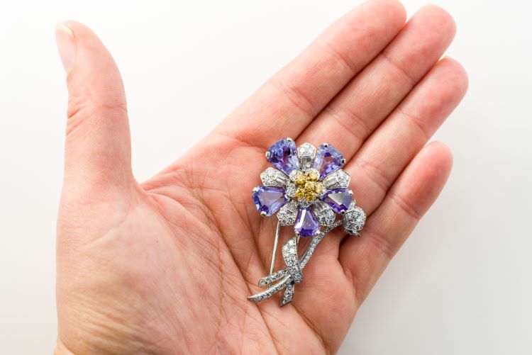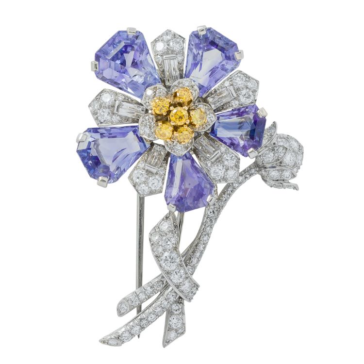 Beautiful vintage C D Peacock sapphire and diamond flower brooch, 5 kite shaped natural sapphires weighing 16 carats, 2 x 1 1/2 inches, platinum.