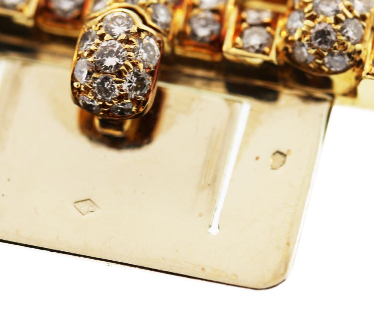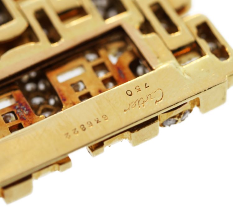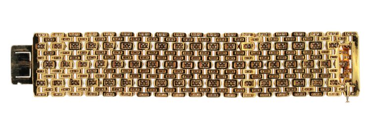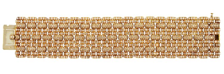 18 karat yellow gold and diamond 'Maillon Panthère' bracelet by Cartier, composed of numerous various sized curved rectangular links set throughout with 1577 round diamonds weighing approximately 38.00 carats, gross weight 208.4 grams, length 7 1/4 inches, width 1 1/4 inches, signed Cartier, numbered 636822, with French assay marks.