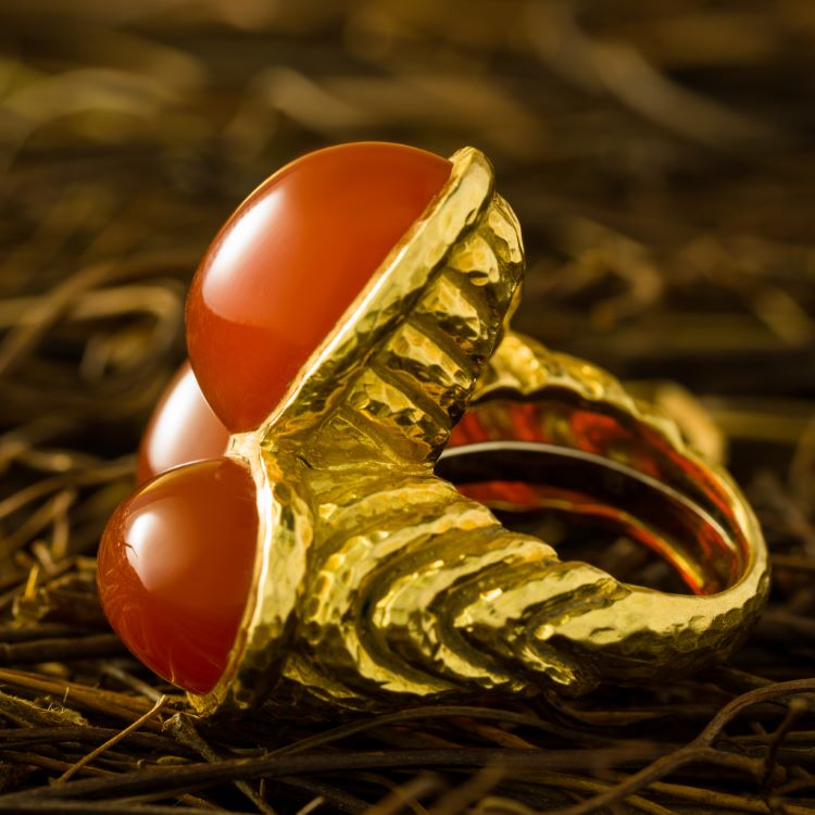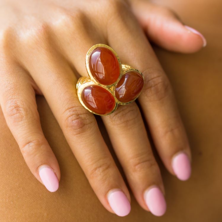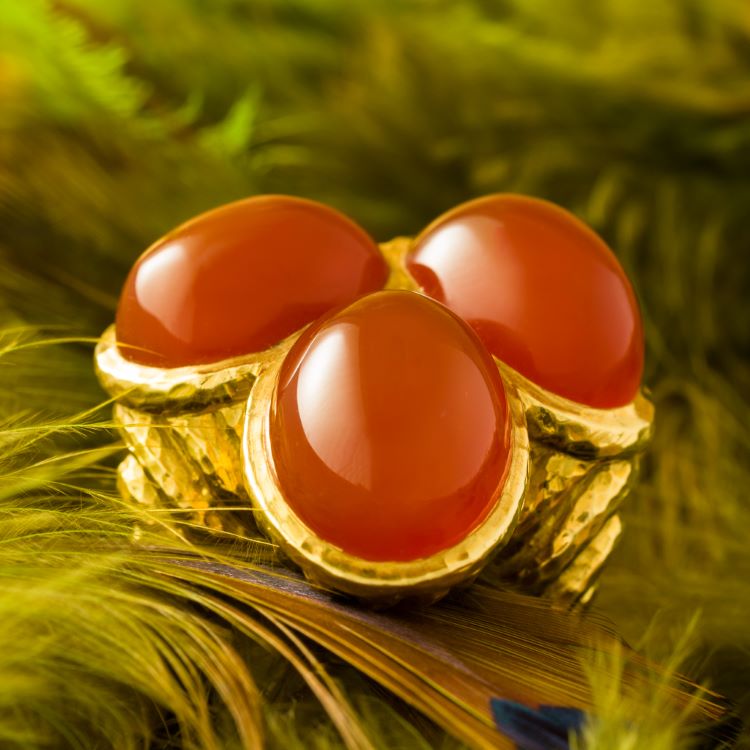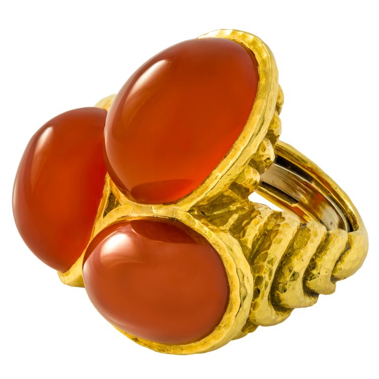 Great vintage David Webb ring with 3 large carnelian cabochons, 18 karat yellow gold, estate ring. Details -signed David Webb 18K © -3 stone cabochon cut carnelian -finger size 8, gross weight 37.0 grams