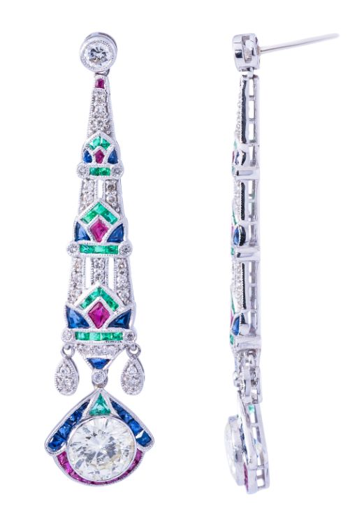 Estate jewelry pair of diamond, emerald, ruby and sapphire art deco style platinum earrings, bottom two diamonds weighing 3 1/2 carats.