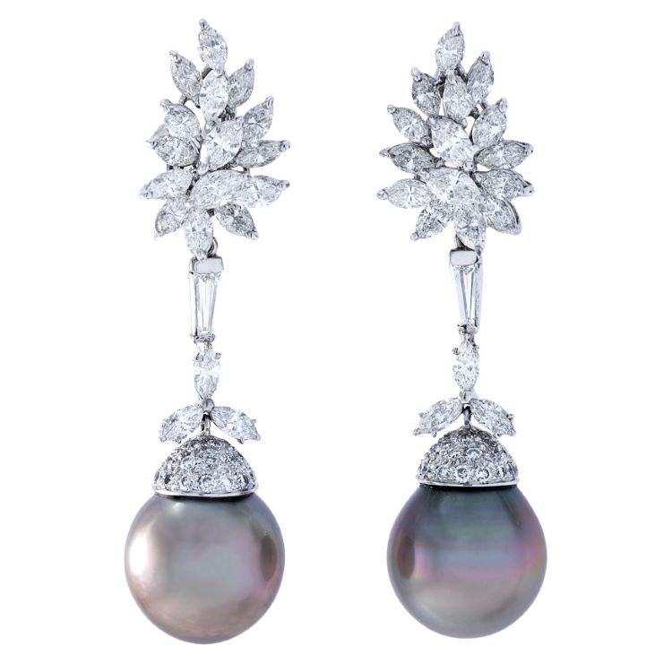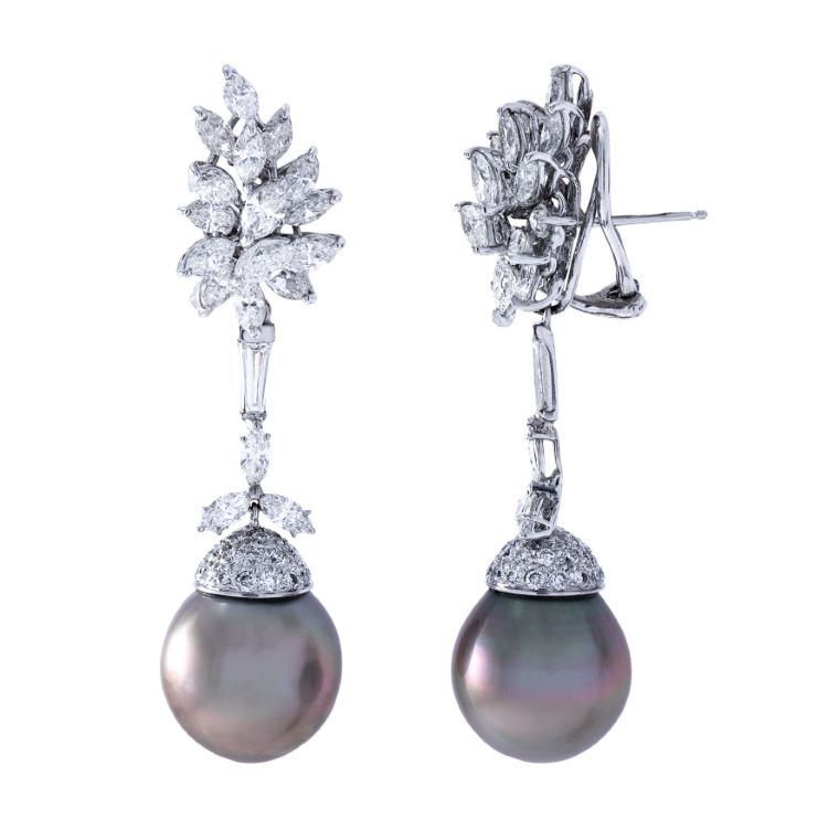 Tahitian pearl and diamond day/night earring drops, handmade in 18 karat white gold