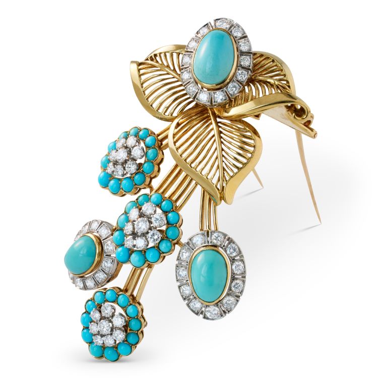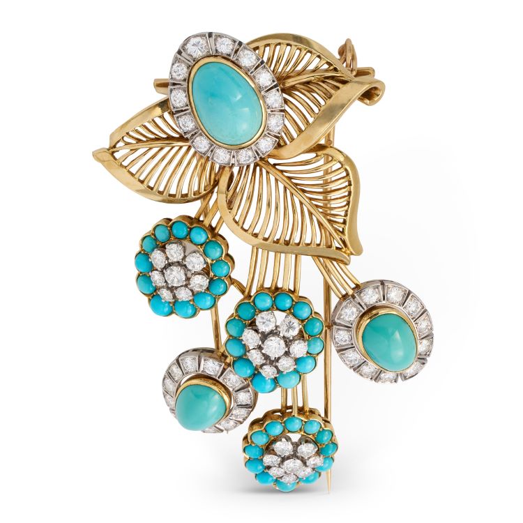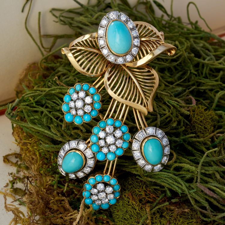 Turquoise and Diamond Brooch, 18 Karat Yellow Gold and Platinum, French