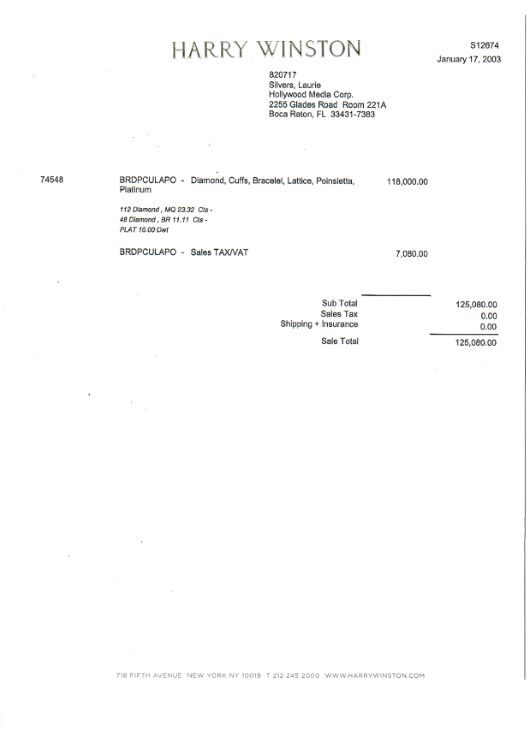 -accompanied by a Harry Winston receipt from January 17, 2003 stating the diamond weights and a retail value of $118,000