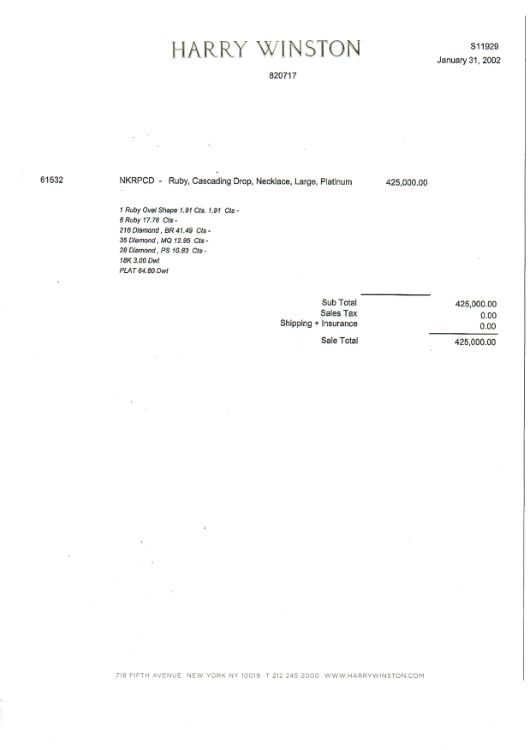 -accompanied by a Harry Winston receipt from January 31, 2002 stating the diamond and ruby weight with a retail price of $425,000