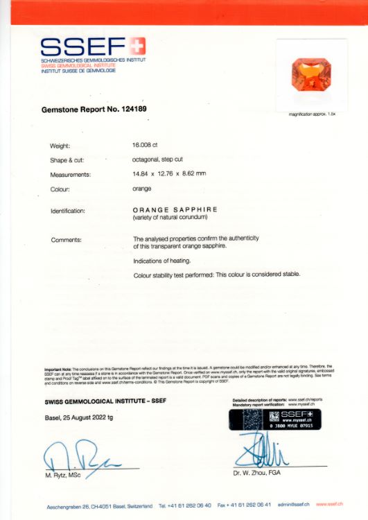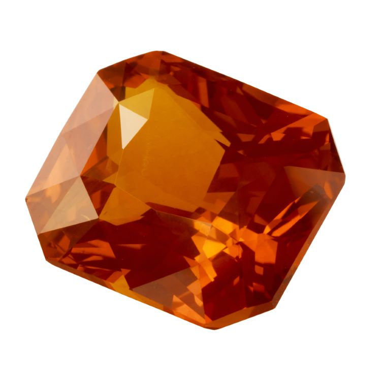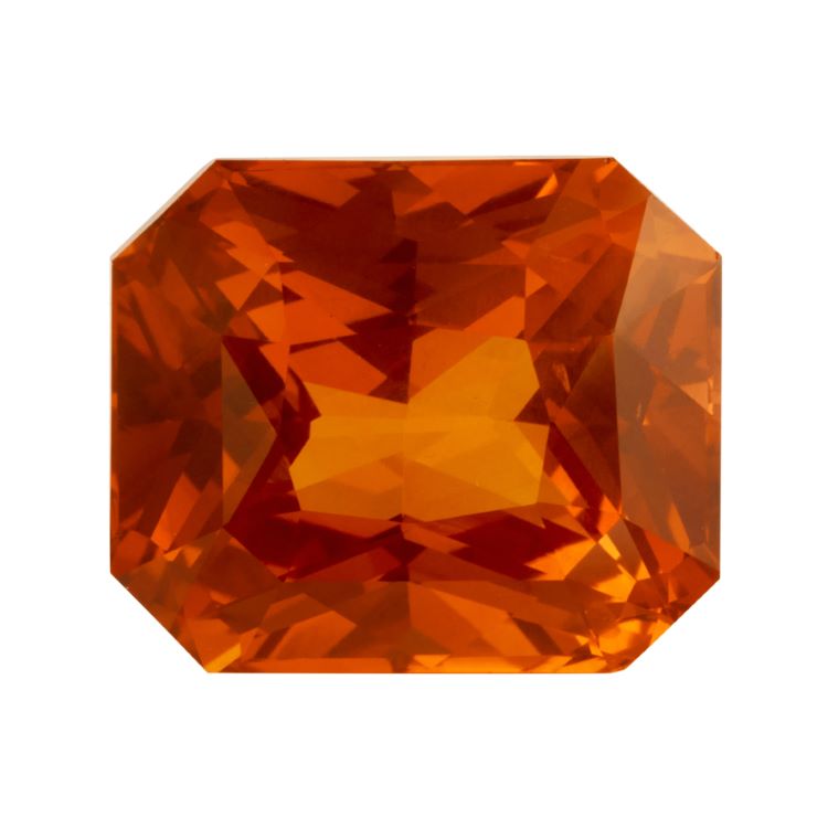 Vivid Orange Sapphire Radiant Cut, Loose -radiant cut orange sapphire weighing 16.00 carats accompanied by an SSEF report stating that the sapphire has indications of heating and the origin is unknown