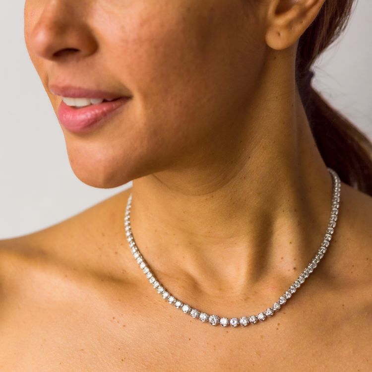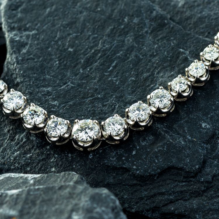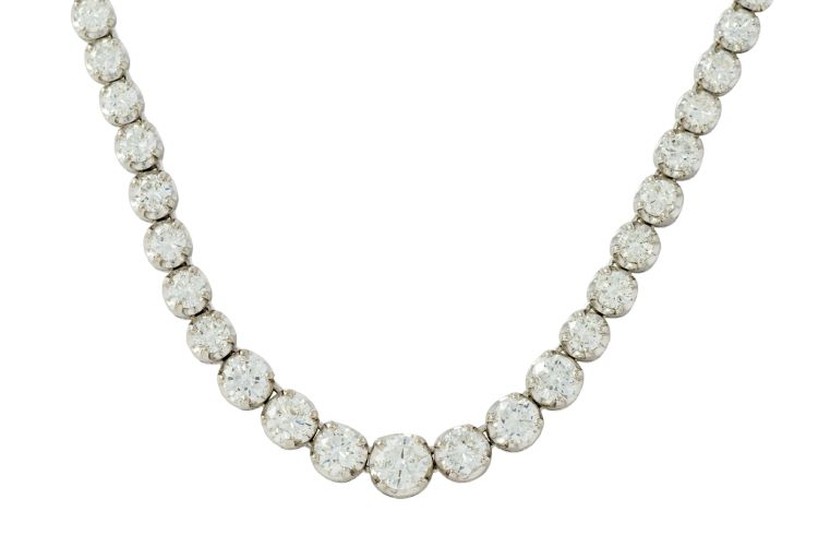 Platinum Graduated Diamond Necklace -98 round cut diamonds weighing 10.00 carats -length 16 1/4", gross weight 34.9 grams, marked Pt900 10.00