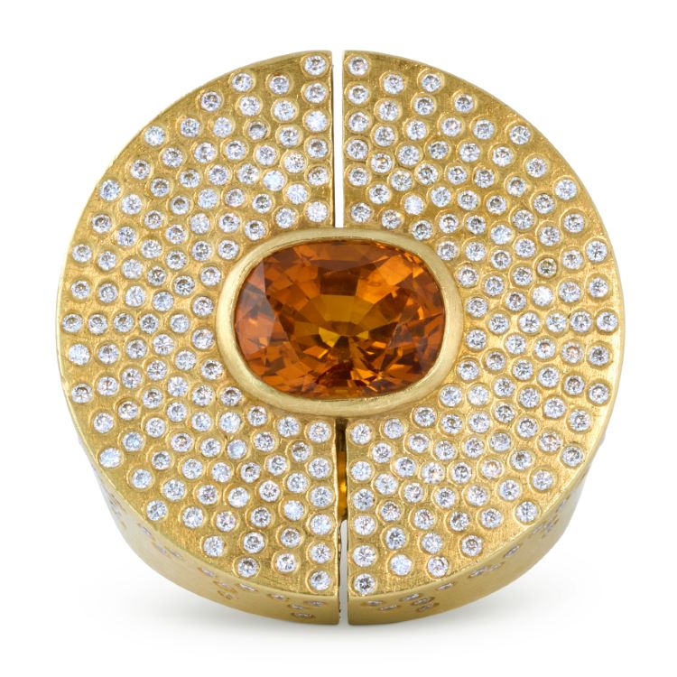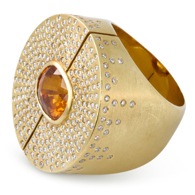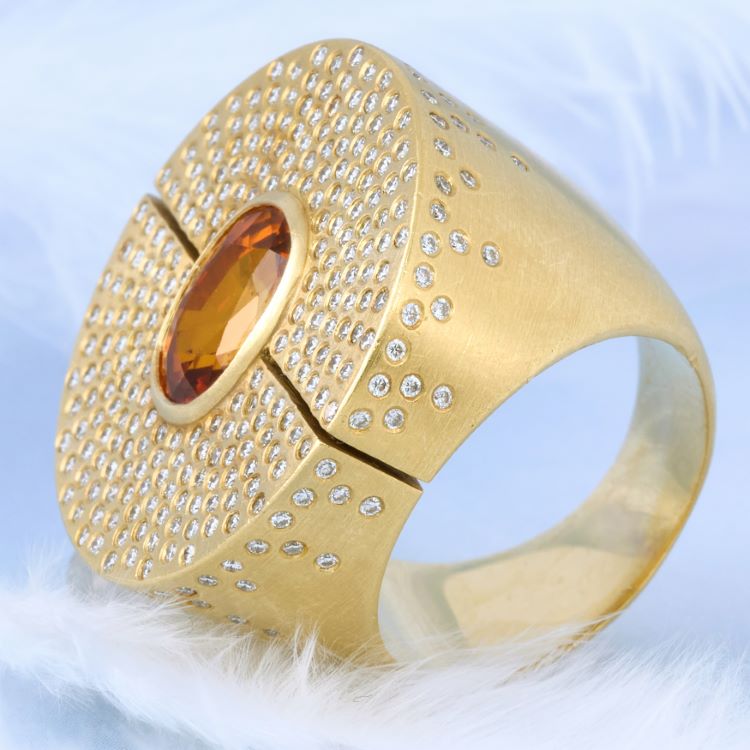 Unique custom orange sapphire and diamond ring created in 18 karat yellow gold with over 300 individually flush set diamonds.