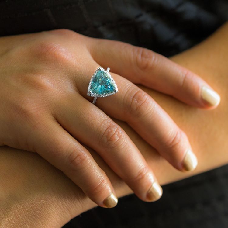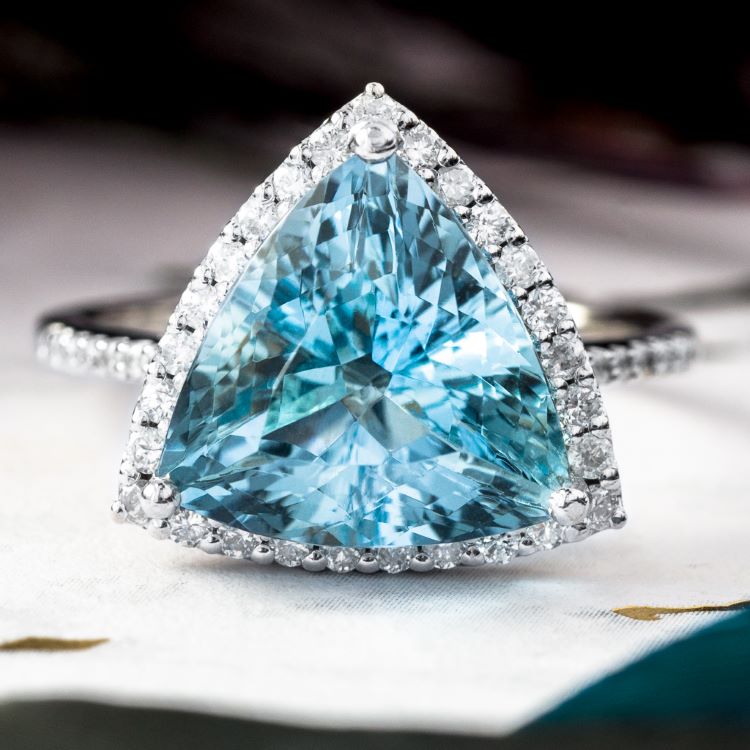 -center triangular cut aquamarine approximately 4.50 carats possessing a medium strong aqua blue hue with very good brilliance and clarity
