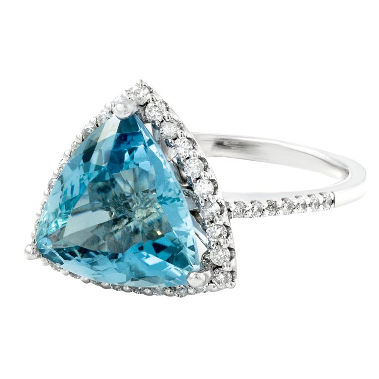 Aquamarine and diamond ring, 4.50 carat triangular cut aquamarine accented by 47 diamonds weighing 1/2 carat, 14 karat white gold estate ring.