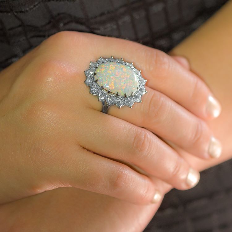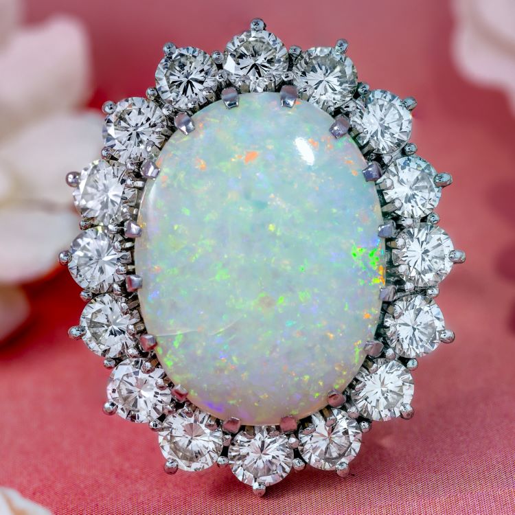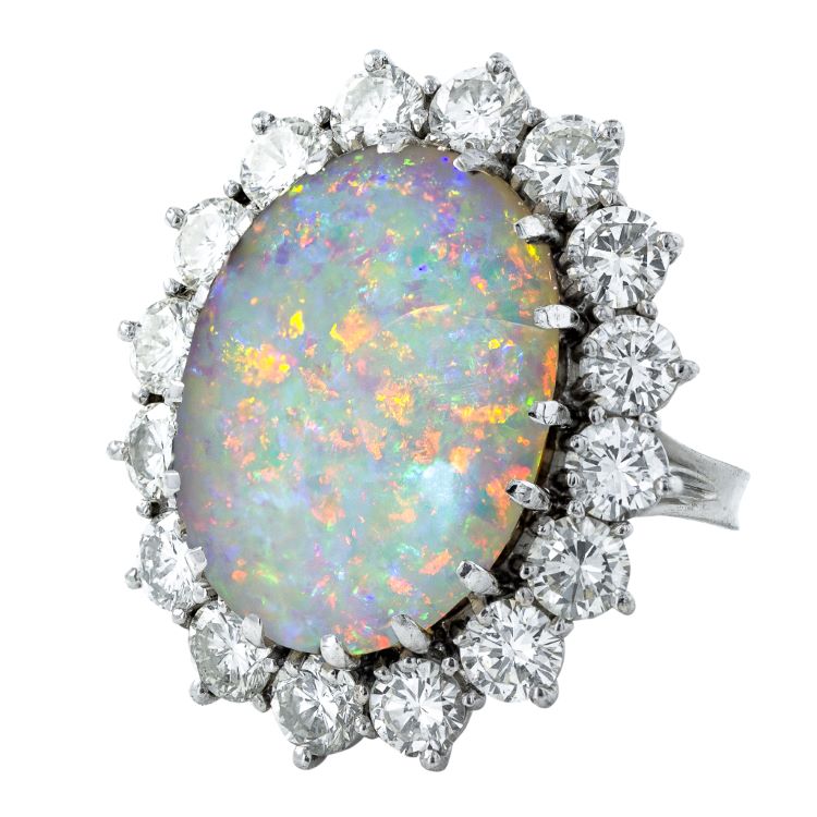 Vintage opal and diamond ring, 8 carat opal surrounded by 16 round diamonds weighing 4.00 carats, 18 karat white gold, estate jewelry ring.