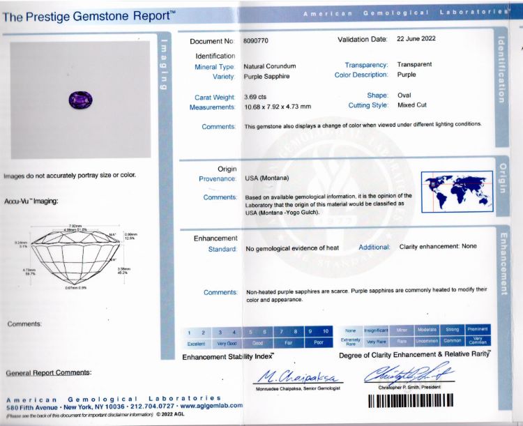 -oval cut purple sapphire weighing 3.69 carats accompanied by an AGL gem report stating that the sapphire is Montana origin and no evidence of heat treatment