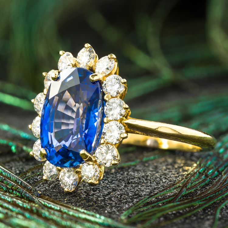Bright, lively cornflower blue sapphire diamond ring, 6.65 carat oval surrounded by 14 round diamonds weighing 1.25 carats, 18 karat yellow gold.