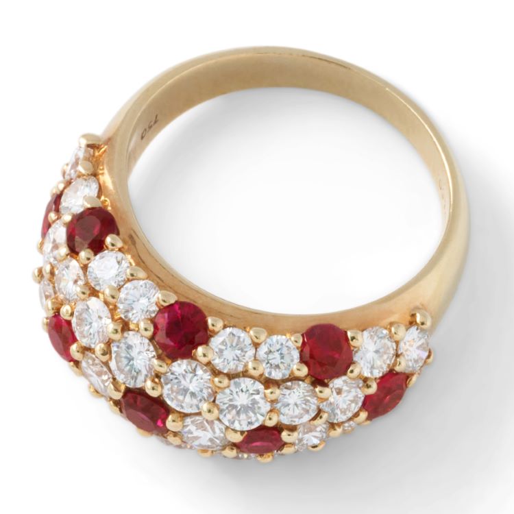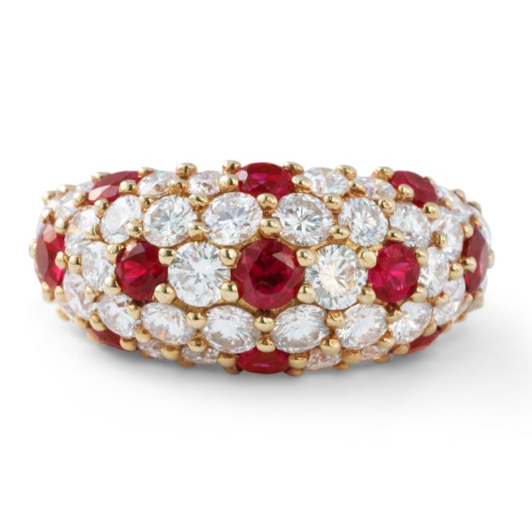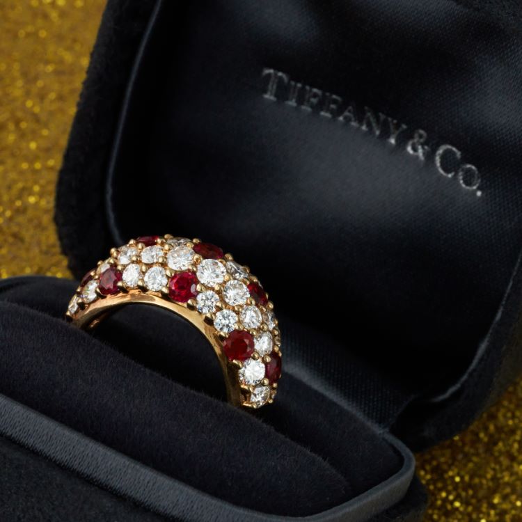 Tiffany and Company domed ring with very deep red, bright rubies accented by high quality diamonds, 18 karat yellow gold estate ring.