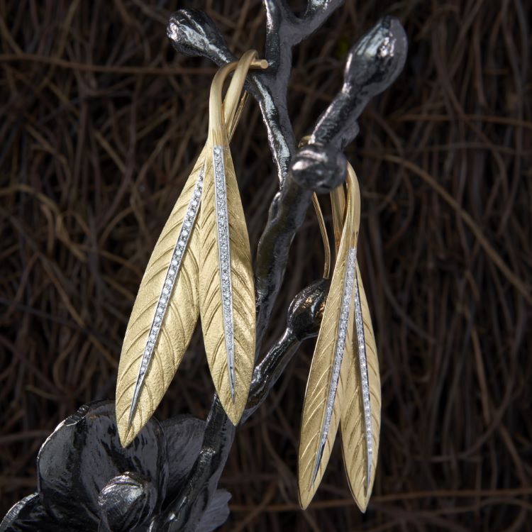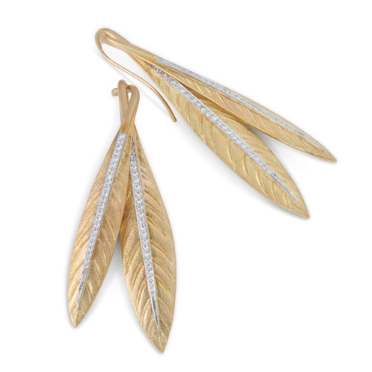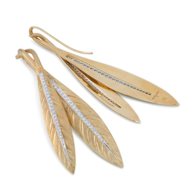 Verdura Tiara Feather diamond earrings, 18 karat yellow gold and platinum Details -marked Verdura Plat 750 with makers mark for Verdura -96 round diamonds approximately 1.00 carats -2 3/4" x 7/8", gross weight 21.8 grams
